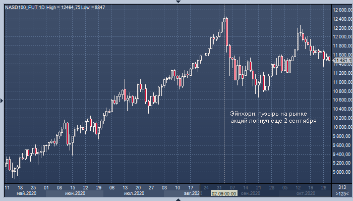 «Текущий вопрос заключается в том, на какой именно стадии пузыря мы находимся?», - спрашивает эксперт. - «Наше рабочее предположение, которое может оказаться неверным, заключается в том, что пузырь лопнул, а рынок акций сформировал вершину 2 сентября. Если мы правы, то настроение инвесторов сейчас меняется с жадности на самодовольство».