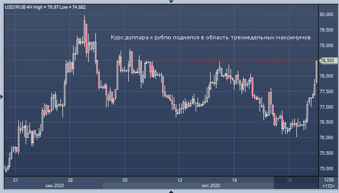 Внешний фон не оставляет российской валюте никаких шансов: цены на нефть снижаются на 3-4%, мировой рынок акций находится в уверенном минусе, а доллар наступает по всем фронтам. Похоже, что как минимум сегодня динамика рубля определяется не популярностью Трампа и Байдена в опросах, а общим снижением спроса на рискованные активы.