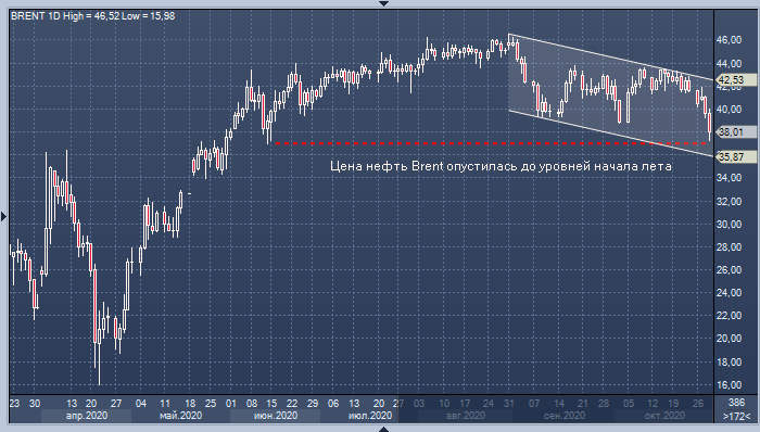Ничем не помогают и США: Белому дому и Конгрессу так и не удалось согласовать новый пакет стимулов, а вчера Минэнерго страны сообщило о росте коммерческих запасов нефти в стране на неделе до 23 октября на 4.3 млн баррелей, а также о том, что ее добыча превысила 11 млн б/д.