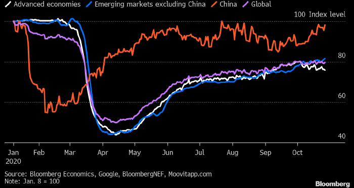 В последнюю неделю октября экономическая активность в развивающихся странах, за исключением Китая, оставалась на 18% ниже докризисных уровней (см. график выше), пишут эксперты Bloomberg Economics. В своих оценках они используют высокочастотные данные, вроде активности использования кредитных карт, динамики перемещения людей и их нахождения в различных локациях.