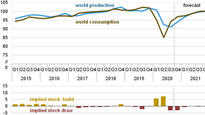 Приведенный выше график отражает динамику мировой добычи нефти (голубым, млн б/д) и ее мирового потребления (коричневым, млн б/д), а также соответствующий прогноз МЭА. Гистограмма внизу отражает рост/снижение мировых запасов нефти и соответствующий прогноз