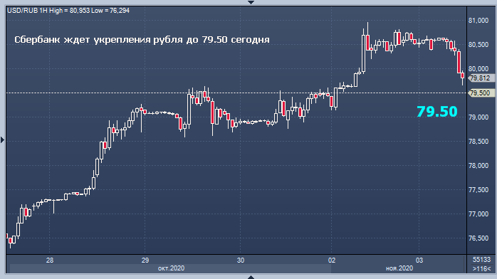 Аналитики Sberbank CIB считают, что во вторник рубль может вернуть утраченные позиции и восстановиться до 79,5 руб./$1. Они обратили внимание на укрепление валют развивающихся рынков и рост фьючерсов на американские фондовые индексы, что говорит о том, что инвесторы настраиваются на решительную победу Джо Байдена на президентских выборах в США.