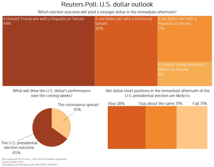 Тридцать девять из 60 аналитиков заявили, что исход выборов будет самым большим фактором роста доллара в ближайшие недели, а не распространение коронавируса, где Соединенные Штаты лидируют в мире по ежедневным инфекциям.