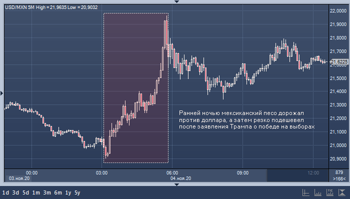 Однако динамика валют развивающихся стран, которые заметно дешевеют против доллара, говорит о том, что форекс уже признал победу Трампа. Так, мексиканский песо не только дешевеет к доллару на 2.5%, но и теряет почти столько же против российского рубля, который считается одним из главных потенциальных бенефициаров победы Трампа (график мексиканского песо к российскому рублю).