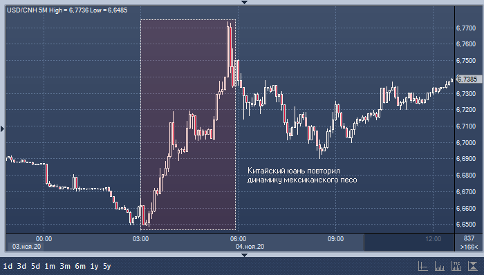 Китайский юань, который на азиатской сессии среды заметно подорожал к доллару на фоне ожиданий победы Байдена, теперь дешевеет на 0.8%.