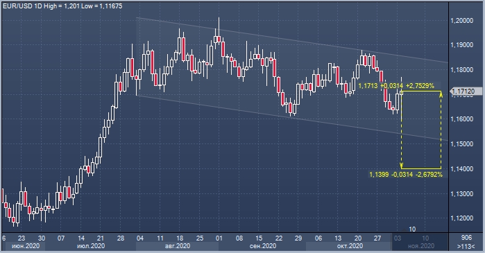 Курс евро/доллар продемонстрировал волатильную сессию в среду: котировки взлетали до 1,1770, но затем рухнули до 1,1600 (минимум с 24 июля) на увеличении вероятности победы Трампа. В итоге к вечеру пара торгуется вблизи уровня начала дня.