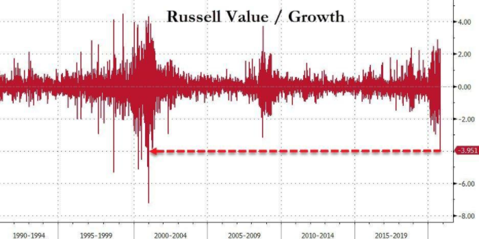 Эти тренды уже проявляют себя, отмечает эксперт. В частности, вчера акции компаний роста (технологические) и акции компаний стоимости (рефляция) показали рекордный за последние почти двадцать лет разрыв в динамике (см. график ниже).