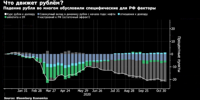 Рубль восстановился после выборов в США, но геополитический риск остается повышенным, особенно если президентом станет демократ Джо Байден. В этом году валюта России ослабла по отношению к доллару на 20%. Bloomberg Economics разработал модель, которая вскрывает причины этого падения. И что интересно — большинство факторов, обусловивших слабость рубля, носят специфический для России и ее валюты характер (см. график).