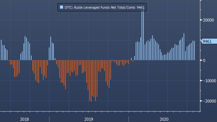 На иллюстрации представлена нетто-позиция по фьючерсам на рубль к доллару фондов, использующих кредитное плечо.