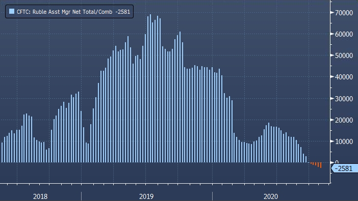 На иллюстрации представлена нетто-позиция по фьючерсам на рубль к доллару управляющих активами.