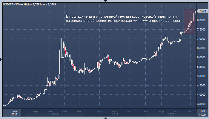 В последние два с половиной месяца курс турецкой лиры почти еженедельно обновлял исторические минимумы против доллара и закрыл торговую сессию пятницы в области 8.50. С конца августа турецкая валюта подешевела на 15% с лишним.