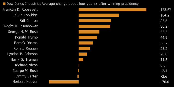 Приведенный выше график отражает совокупную динамику индекса Dow Jones Industrial Average за четыре года (1455 дней), последовавших за днем выборов при разных президентах США. Источник: Bloomberg