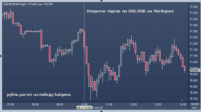 Рубль и российские акции открылись сильным ростом, поскольку нефть марки Brent выросла после победы Джо Байдена на выборах в США, сообщает Bloomberg. Рубль ранее рос на 0,6% до 76,9825, при этом USDRUB может упасть ниже 50-дневной скользящей средней, отмечает агентство. 10-летняя эталонная рублевая доходность падает четвертый день, снизившись на 3 б.п. до 5,87%.