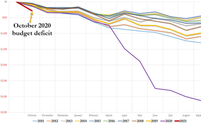 Вчера Минфин США опубликовал данные за октябрь, которые показали дальнейшее ухудшение ситуации. В первом месяце финансового 2021 года дефицит федерального бюджета страны достиг рекордных для октября $284 млрд, что оказалось на $10 млрд больше прогнозов и в два с лишним раза выше показателей октября 2019 года на уровне $134.5 млрд.