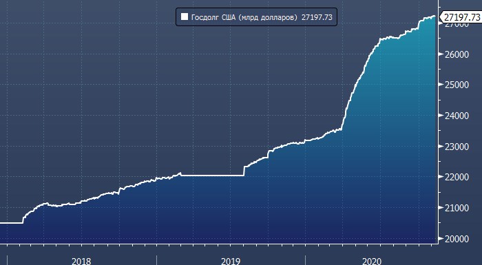 Дефицит бюджета США в финансовом 2020 году, который закончился в сентябре, составил рекордные $3.1 трлн, что оказалось в три с лишним раза выше аналогичного показателя 2019 года на уровне $954 млрд. Расходы бюджета в $6.552 трлн почти вдвое превысили его доходы в $3.420 трлн.