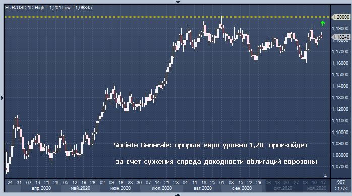 Продолжающееся сокращение спрэдов между доходностью основных и периферийных государственных облигаций еврозоны может привести к росту евро, считает Societe Generale. Ноябрьский максимум евро в 1,1920 доллара "может стать последним препятствием перед тем, как мы увидим новый прорыв уровня 1,20 доллара", - считает стратег SocGen FX Кит Джукс.