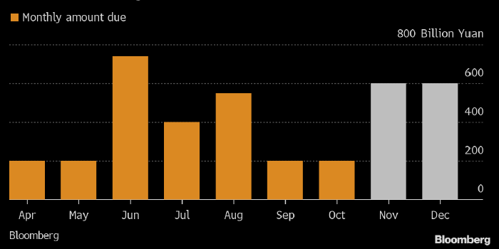 Приведенный выше график отражает объемы погашений облигаций банками Китая по месяцам в млрд юаней. Источник: Bloomberg