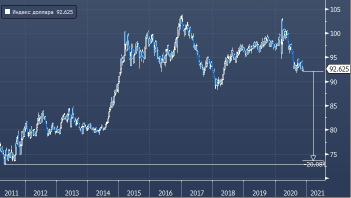 Доллар, как считают в Citigroup, в 2021 году, вероятно, подешевеет на 20%, если вакцины против Covid-19 станут широко распространены и помогут оживить мировую торговлю и экономический рост.