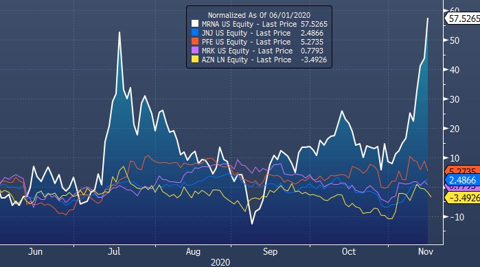 Приведенный выше график отражает процентное изменение акций компаний фармацевтической отрасли в третьем квартале: Moderna (белым с заливкой), Johnson and Johnson (голубым), Pfizer (красным), Merck (фиолетовым) и AstraZeneca (желтым). Источник: Bloomberg
