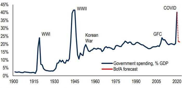 Приведенный выше график отражает динамику расходов бюджета США в % от ВВП страны (синим) и прогноз Bank of America (красным). Источник: Bank of America