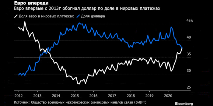 Объем глобальных платежей в евро в октябре вырос до 37,8%, что впервые с 2013 года превышает объем использования доллара, показали данные Общества всемирных межбанковских финансовых каналов связи. Евро вырвался на лидирующие позиции в силу падения курса доллара.
