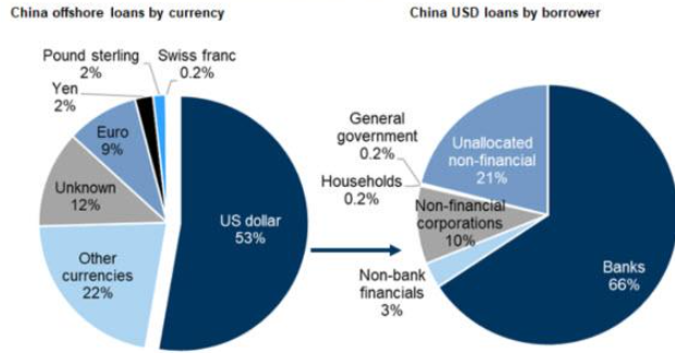 Приведенная выше иллюстрация отражает структуру внешних займов китайских компаний: по валютам (слева) и по заемщикам (справа). Данные: Банк международных расчетов, источник: Bloomberg