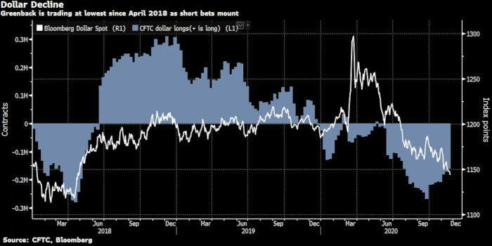 График индекса доллара Bloomberg и чистой позиции по доллару от CFTC © 2020 Bloomberg