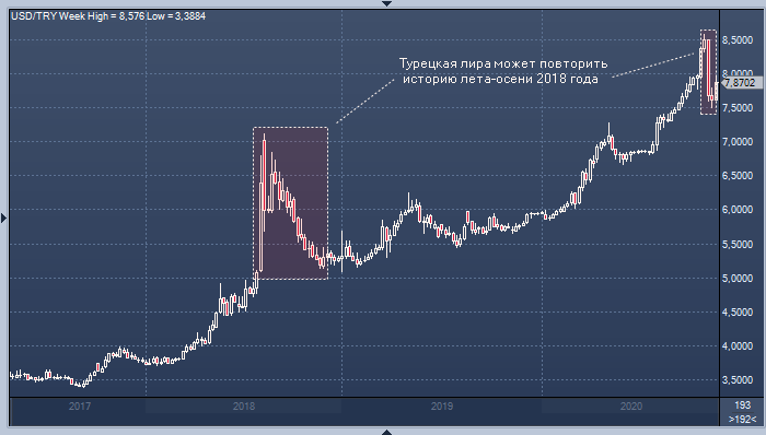 Впрочем, снижение лиры может оказаться краткосрочным, и турецкая валюта может повторить траекторию лета-осени 2018 года, прогнозирует главный экономист HSBC Asset Management в Анкаре Ибрагим Аксой. В августе 2018 года лира резко подешевела к доллару, затем начала расти, но вскоре скорректировалась вниз после шокового повышения ставок ЦБ Турции. После этого лира возобновила аптренд и к декабрю отыграла почти все августовское снижение (см. график ниже - прим. ProFinance.ru).