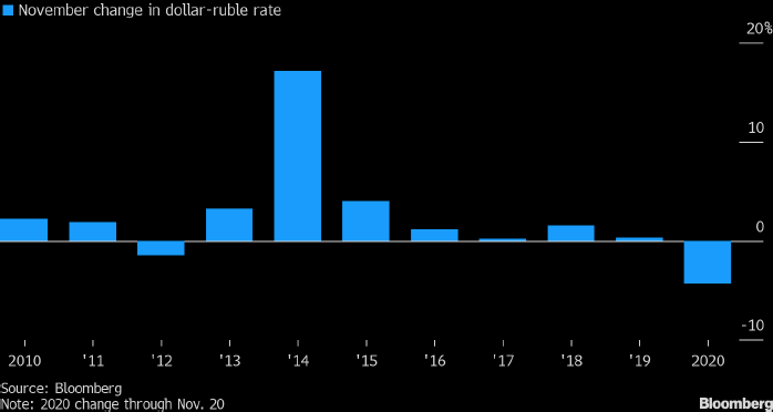 Приведенный выше график отражает процентное изменение курса доллара к рублю в ноябре в период с 2010 по 2020 годы. Источник: Bloomberg