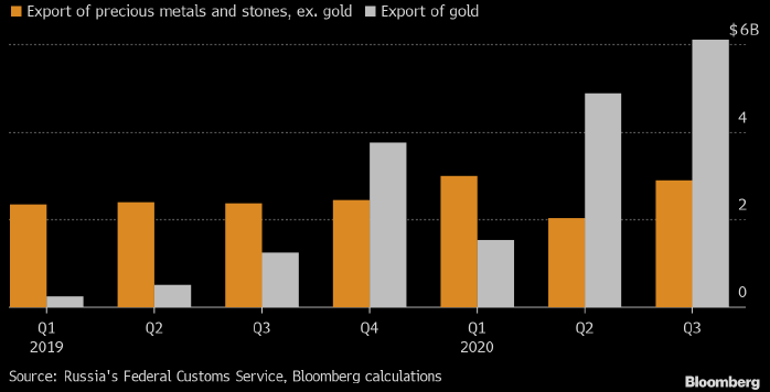 Приведенный выше график отражает квартальный объем экспорта из России драгоценных металлов и камней, за исключением золота (оранжевым, в млрд долларов) и золота (серым, в млрд долларов). Источник: Bloomberg