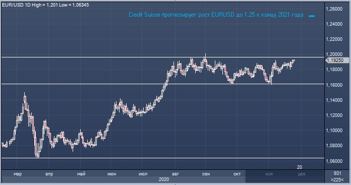 Credit Suisse прогнозирует рост EURUSD до 1,25 к концу 2021 года на фоне более благоприятного структурного внешнего баланса по сравнению с США и снижения политических рисков.