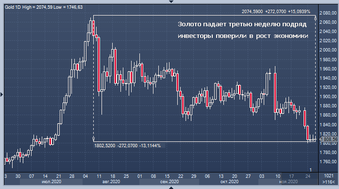 Цены на золото снижаются третью неделю подряд, так как растущий оптимизм по поводу вакцины от коронавируса вынудил инвесторов перейти к традиционно более рискованным активам и уходить из защитного драгметалла.