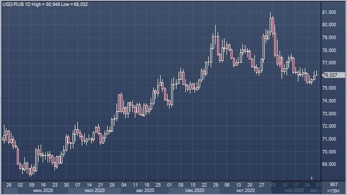 Курс рубля на прошлой неделе попытался закрепиться ниже 75,50, но безуспешно. С тех пор российская валюта слабеет 4 дня подряд, но пока не может подняться выше 76,50.