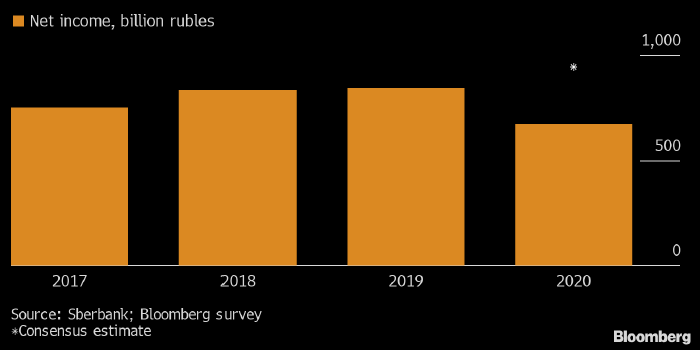 Приведенный выше график отражает динамику чистой прибыли Сбербанка в млрд рублей. Источник: Bloomberg