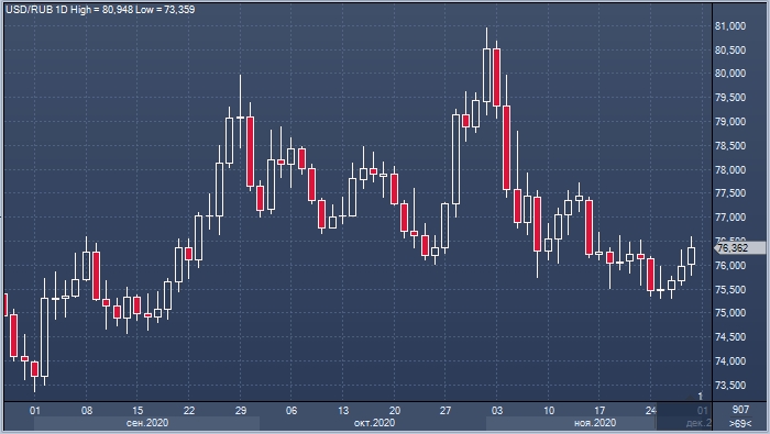 Курс USDRUB на прошлой неделе закрылся ниже 76,00 впервые с середины сентября. Однако в понедельник отскочил почти на 40 копеек выше этого уровня. Нефть упала примерно на 1% в понедельник из-за неуверенности в том, что ОПЕК+ согласится на продление сокращения добычи на переговорах на этой неделе, но надежды на вакцину COVID-19 позволили сохранить потенциал роста после увеличения цен в ноябре более чем на 25%.