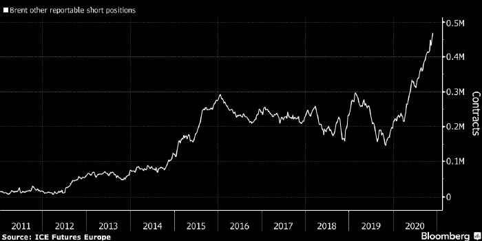 Приведенный выше график отражает размер короткой позиции игроков из категории «other reportables» во фьючерсах на нефть Brent в млн контрактов. Источник: Bloomberg