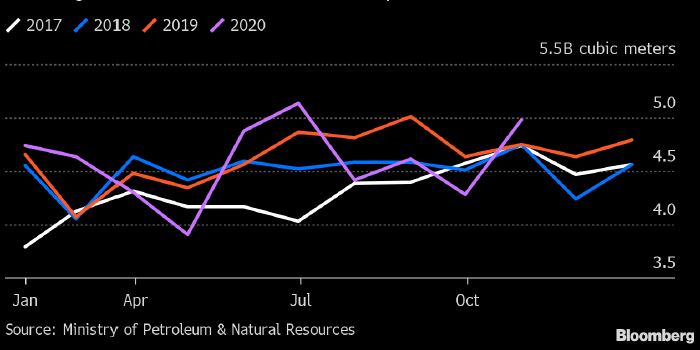 Приведенный выше график отражает динамику потребления газа в Индии в последние четыре года (млрд кубометров). Источник: Bloomberg