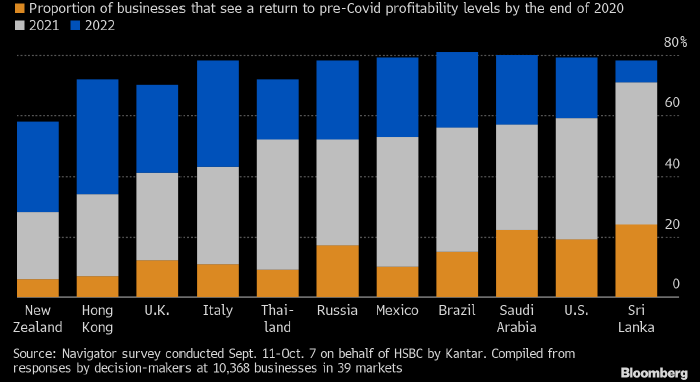 Чуть больше половины компаний мира надеются вернуться к докризисным показателям по прибыли в этом году или в следующем. Таковы результаты опроса 10 400 компаний из 39 стран, который провел Kantar по заказу HSBC.