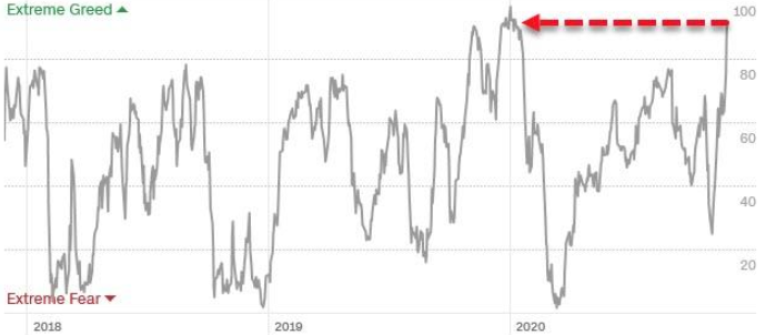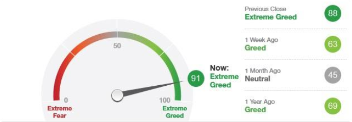 Индикатор страха и жадности на рынке акций, который рассчитывает Citi, достиг экстремально бычьего значения на уровне 91% (0% означает экстремальный страх, а 100% - экстремальную жадность, см. график выше — прим. ProFinance.ru). Инвесторы не видят других альтернатив, кроме как покупать акции, и это провоцирует резкий перекос рынка, отмечает главный стратег Citi по рынку акций США Тобиас Левкович.