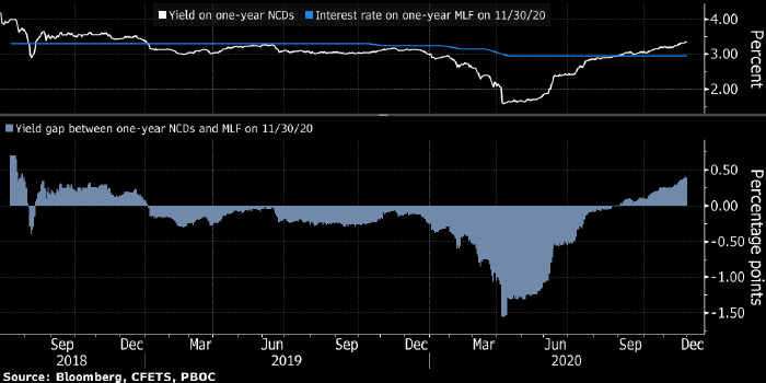 Приведенный выше график отражает динамику ставок на межбанковском рынке Китая (белым) и стоимость среднесрочной ликвидности ЦБ страны (голубым). Нижняя часть графика отражает разницу между этими показателями. Источник: Bloomberg