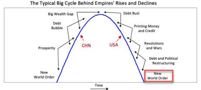Рэй Далио нарисовал «типичную схему большого цикла роста и упадка империй» (см. график выше), из которой следует, что США скатываются вниз с вершины могущества, тогда как Китай к ней только стремится.