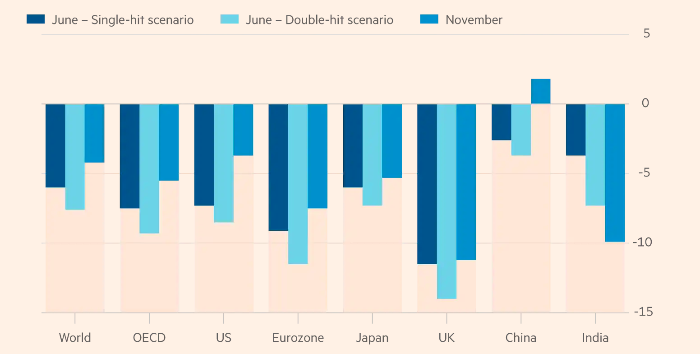 Последние экономические прогнозы ОЭСР с точки зрения последствий Covid-19 не столь пессимистичны. Хотя еще в июне на фоне неопределенности эта международная организация со штаб-квартирой в Париже, выпустила не один, а два прогноза, и ни один из них она так и не назвала предпочтительным. Оптимистичный прогноз предполагал «один удар» со стороны коронавируса, а пессимистичный — двойной. На деле же большая часть мира, особенно США и Западная Европа, пострадали от двойного удара. Тем не менее, как ожидается, экономические результаты в этом году будут лучше, чем в случае одного удара.
