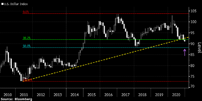 Это — важная поддержка, которая остановила снижение индекса доллара в начале 2018 года.