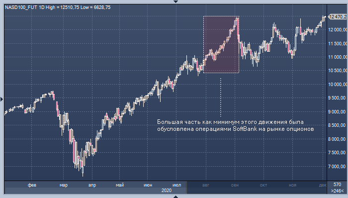 *ProFinance.ru: Financial Times наряду с другими изданиями сообщила о том, что агрессивные операции японского финансового гиганта на рынке деривативов внесли значительный вклад в рост рынка акций в предыдущие месяцы. В частности, SoftBank покупал большие объемы колл-опционов на акции технологических супергигантов, которые имеют большой вес в фондовых индексах США, заставляя дилеров покупать базовый актив и тем самым толкать рынок вверх.