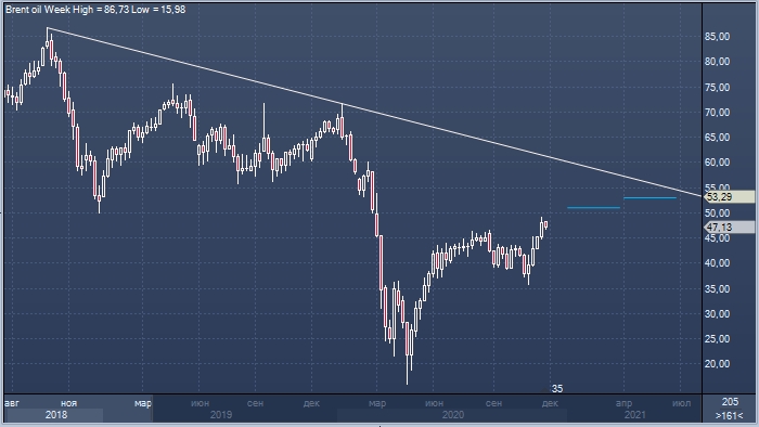 Прогноз Brent в 1 квартале — 51 доллар (пред 48 долларов); прогноз на 2 квартал — 53 доллара (пред. 50 долларов)