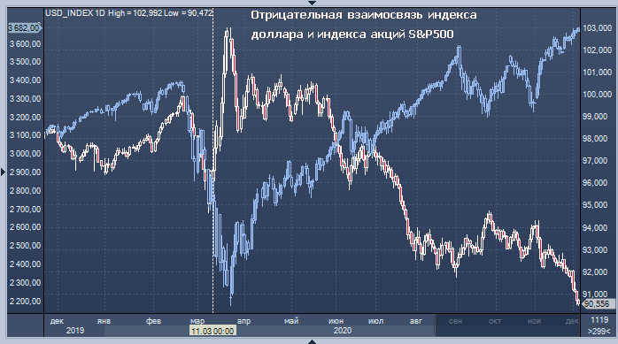 График индекса доллара DXY и индекса акций США SP500 интервалами в 1 день