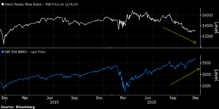 Индикатор «умных денег» снижается на фоне рекордного за последние годы притока денег на фондовый рынок и роста оптимизма относительно скорого появления эффективных вакцин от коронавируса. Все это заставляет хедж-фонды и розничных спекулянтов без оглядки скупать акции и колл-опционы на них.