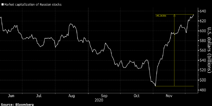 После выборов президента США 3 ноября капитализация рынка акций России выросла почти на $150 млрд и превысила $630 млрд (по состоянию на закрытие вчерашней торговой сессии, см. график ниже — прим. ProFinance.ru). Рынок акций развивающихся стран переживает третий по масштабам рост с 2008 года, и его капитализация вплотную приблизилась к рекордным $25 трлн.