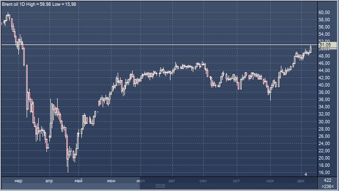 В четверг цены на нефть выросли более чем на 4%, при этом цена на нефть марки Brent поднялась выше 50 долларов за баррель впервые с начала марта, чему способствуют надежды на более быстрое восстановление спроса, поскольку страны начинают массовое распространение вакцин против COVID- 19.