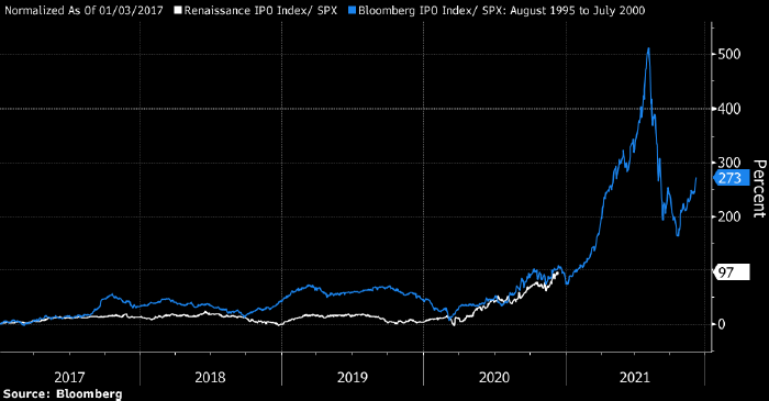 Приведенный выше график отражает динамику FTSE Renaissance Global IPO Index относительно S&P 500 в период с 2017 по 2020 годы (белым) и аналогичную динамику Bloomberg IPO Index в период с 1995 по 2000 годы (голубым). Источник: Bloomberg